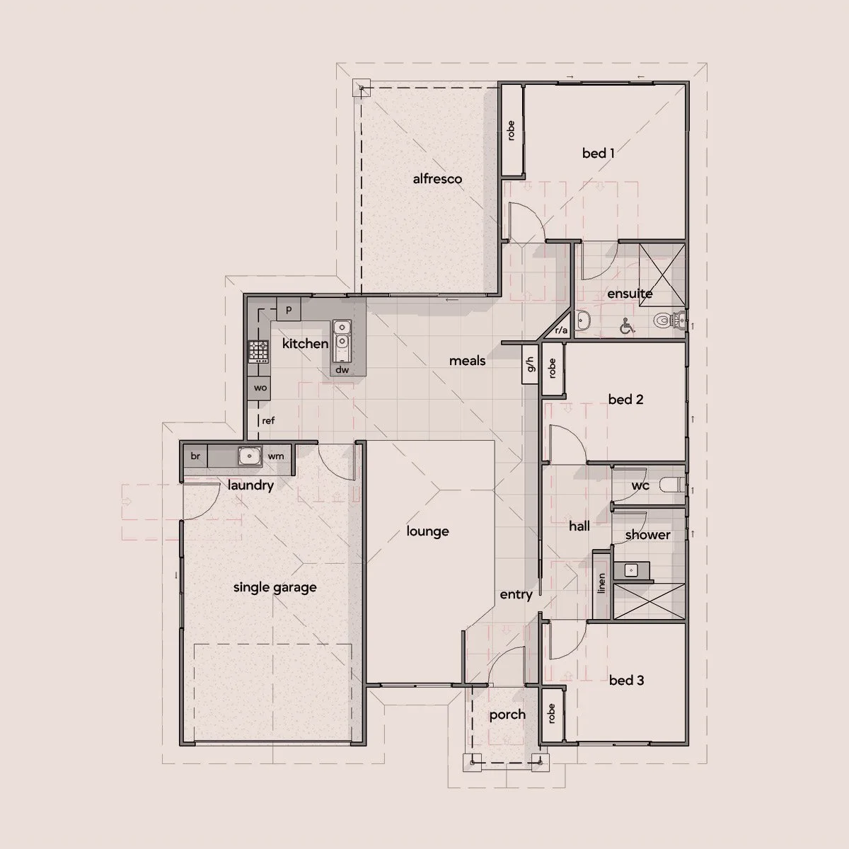 Three well-proportioned bedrooms include a main suite with a wheelchair-friendly ensuite. The alfresco space encourages outdoor relaxation, while the single garage and integrated laundry provide everyday convenience.